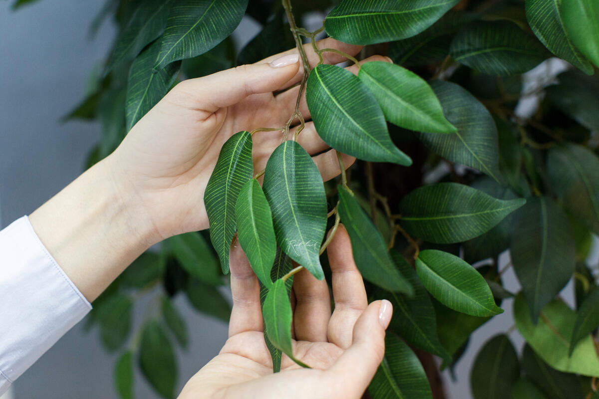 The leaves are made of textile with a printed vein pattern. Each branch has a metal wire inside and is easy to bend, so you can make the foliage look lush and airy. The trunk is natural and consists of several stems intertwisted like lianas
